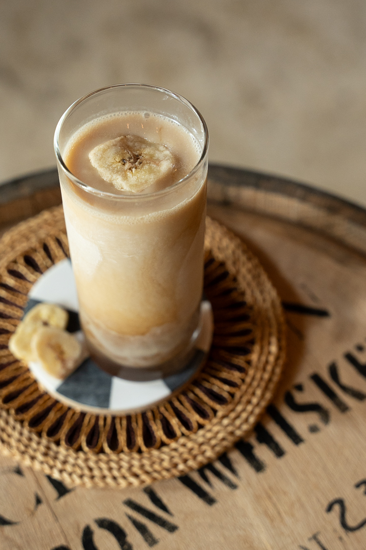 Pour all ingredients except cold brew into a blender over ice. Blend until smooth and pour into a collins glass and top with cold brew coffee. Garnish with a banana chip.