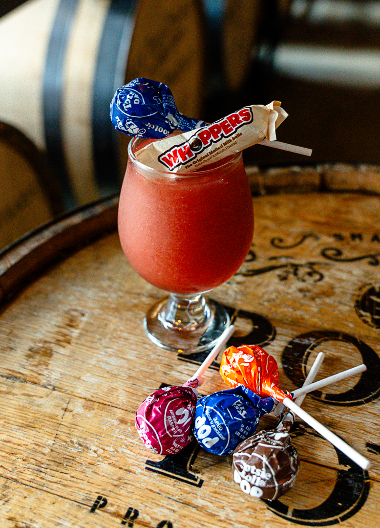 Pour all ingredients into a blender with ice and blend until smooth. Garnish with a Tootsie Pop & Smarties.